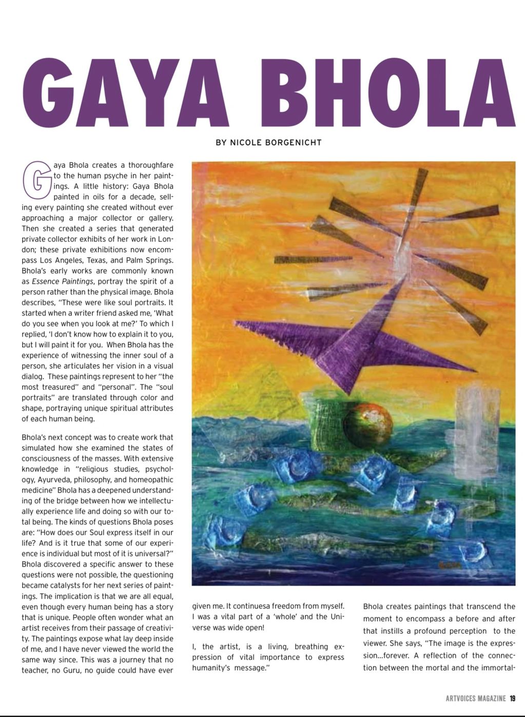 Gaya Bhola is a visionary surrealistic artist of international fame whose critically acclaimed art has been featured in Miami, and solo exhibitions in California, London (sponsored by Air India) and Basel.